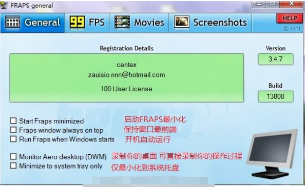 1、双击fraps.exe后,出现下图画面,已标注中文意思。