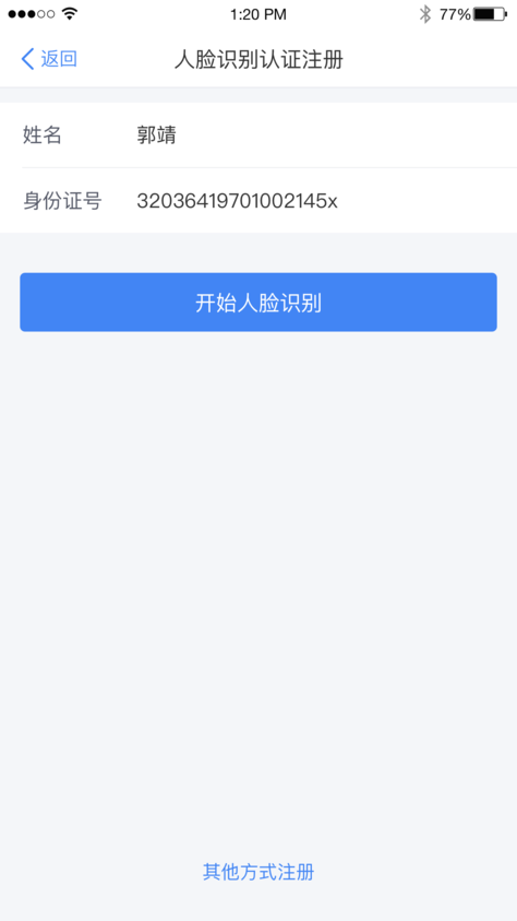 在身份证界面,输入身份证号码及姓名,开始人脸识别,系统跳转到识别界面,手机摄像头对准自己头像,按提示操作,识别通过。