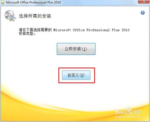 3、在选择所需的安装界面,可以选择立即安装,也可以选择自定义,自定义的好处是可以去掉我们不需要安装的软件,并自己选择软件安装位置,我们以自定义为例;