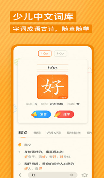 1、中文查词全面覆盖字、词、成语及古诗词;2、英文查词为少儿量身定制遵循了该年龄段的认知水平;