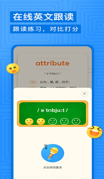 “不敢开口”是语言学习中最容易陷入的窘境,现实生活中许多孩子都怕说错、发音不准,但又苦于没有标准示范。有道少儿词典提供发音跟读功能,在示范领读之后支持用户跟读单词和表情打分,鼓励孩子主动“听”、开口“说”。