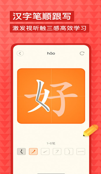 * 汉字笔顺:汉字全部配置笔顺动图及跟写练习,并为每一个汉字录入真人发音,为儿童带来多感官学习体验。