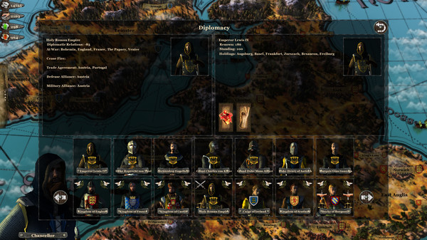 随着战果累计,玩家将能接触到王国内的复杂外交关系网络。服务于你的国王,维护与其他领主之间的关系,甚至影响整个欧洲的政局走向。有了足够强大的力量之后,玩家还能够推翻国王,自己做主。这将展开新一层级的游戏内容。玩家能够征募,分封领主,并用复杂的欧洲政治外交系统来凝聚你的王国。