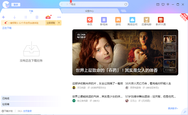 精致的简约体验:新版迅雷X界面尺寸更加小巧,兼容1024X768以上的屏幕分辨率,小屏幕也能适应。更加聚焦下载:新版迅雷X对相关下载信息进行强化,如任务的下载速度变化曲线,镜像资源的数量,以及各个文件的下载进度。延续迅雷9上实用性很高的资源评论,只要用户一选中任务,就会出现下载过该任务的用户评论。资源该不该下,广大雷友告诉你。
