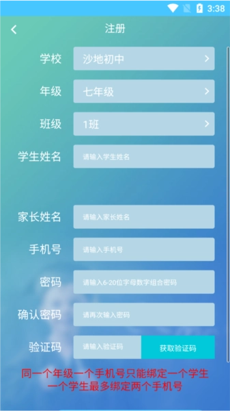 4、新用户进行注册时,需依次输入学生信息与家长信息,获取验证码并完成输入,随后点击提交,即可完成注册流程。