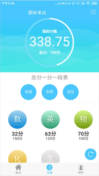 6、接下来,点击学情达底部的【学情】菜单,便能查看到各科成绩,示例如图。