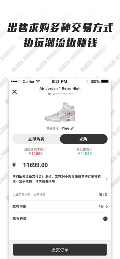 黑市是一款在线服饰鞋品购物app,帮助追求时尚的年轻人打造一个潮流的互联网社区,产品特色在于对高端限量的鞋服融入了集合竞价的概念,搭建起一个属于年轻消费者的C2C在线集合/拍卖平台。一个属于年轻人的潮流APP