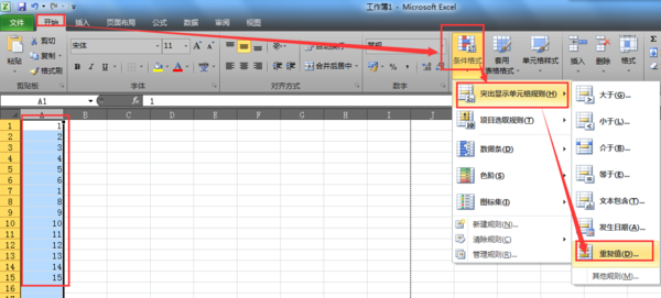 office2007怎么把相同数据标黄?1、选中该列内容,点击开始——条件格式——突出显示单元格格式——重复值;