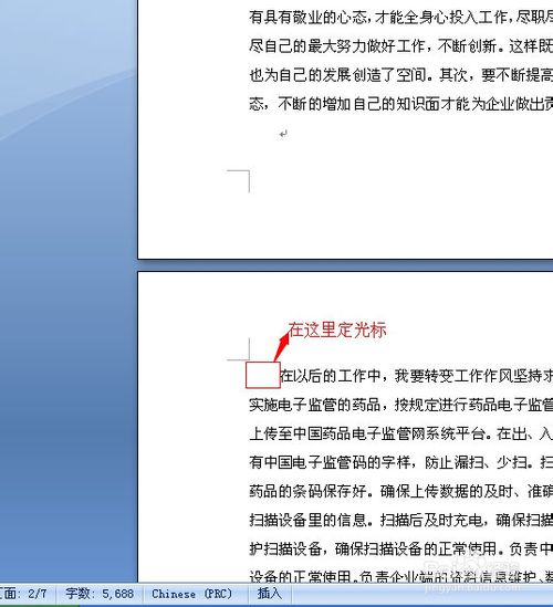 1、打开一个word文档,在要开始设置页码的那一页前面设置光标,将光标设置到那一页的最前面,如图所示,小编从第二页开始设置。