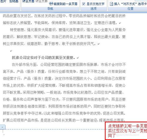 5、文档会出现页眉页脚,在上面页眉页脚的菜单中选择转至页脚,光标到了页脚处,再点击链接到前一条页眉。此时文档页眉页脚右边的字(与上一节相同)消失。点击保存。