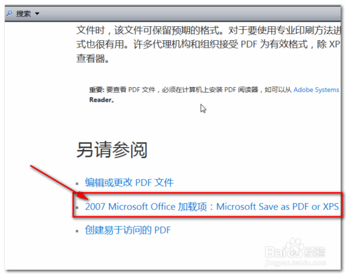 在文章未尾”另请参阅“栏目下找到“2007 Microsoft Office 加载项:Microsoft save as PDF or XPS“点击并打开相应页面(自动打开浏览器,并跳转到Microsoft的官方下载页面)