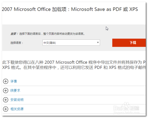 4、在下载页面找到2007 Microsoft Office 加载项:Microsoft save as PDF or XPS,选择相应语言 ,然后点击下载。