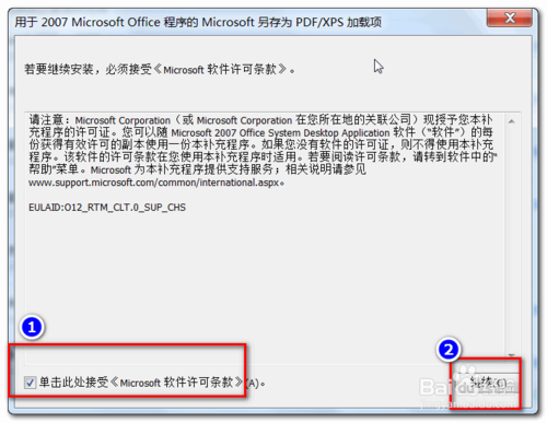 同意相关条款,打开复选框的钩,然后继续。等待安装完成。