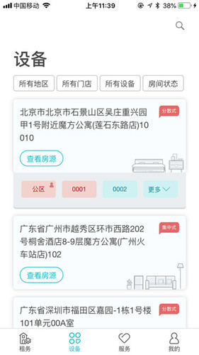 房源分级管理——根据项目、地区定义房源并可自由组合,方便管理者做不同门店的分级管理。路径顺畅统一——管理路径统一在设备页,设有租客入住/退租、密码发放等快捷操作模块,流程顺畅。