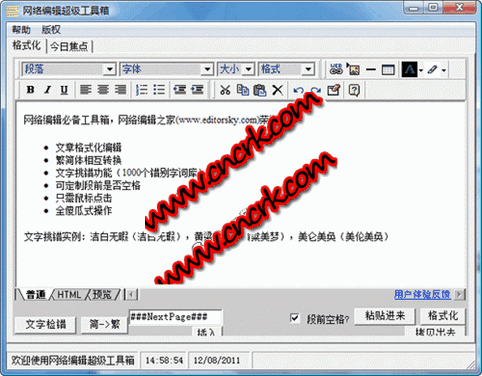 网络编辑超级工具箱提供的文章快速格式化功能,可帮助您快速格式化文章,使之成为合乎规范和标准的文章格式,能有效提高编辑工作效率,加快工作进度。
