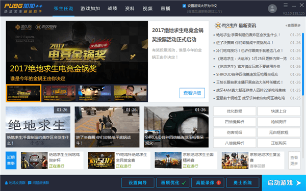 玩家安装好程序之后,打开超级助手,就会来到吃鸡助手的首页。绝地求生超级助手2.0的版本保留了此前主播们与玩家们广泛使用的游戏优化功能,并且新加入了游戏大厅汉化,高能录像与勇士系统三大功能。