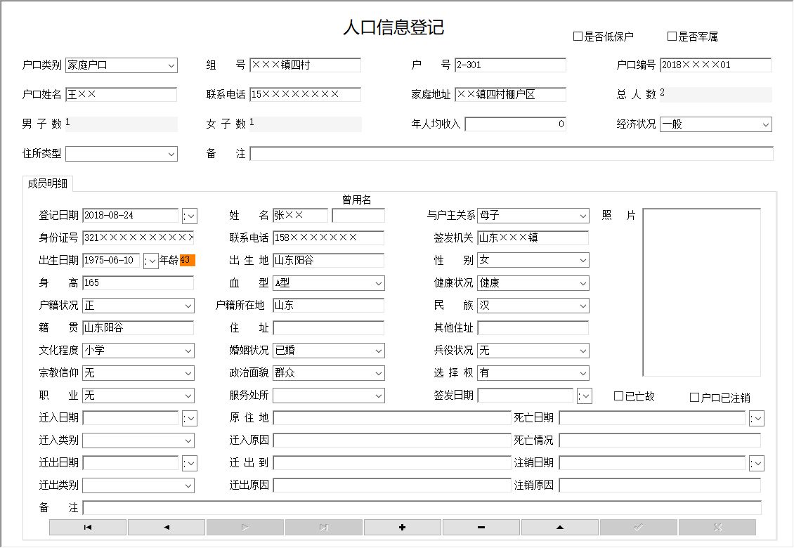 《人口管理系统简易版》是专门为小区,农村人口,社区开发的一套系统,不仅满足了家庭信息、个人信息及通讯录的输入,输出,存储,添加,删除,还设计了按户号,民族,政治面貌,学,及多个、单个人员详细信息等多项查询,简单易操作。 系统包含: 基本信息:人口信息、单位信息 人口查询:按年龄段查询、按兵役情况查询、按文化程度查询、按低保户查询、按住所类型查询、按户口类别查询、按联系电话查询、按身份证号查询、按出生日期查询 软件界面设计简洁、美观、其人性化的管理可以使用户轻易上手,提升服务质量,提高工作效率,是协助各慈善机构优化管理的好帮手。