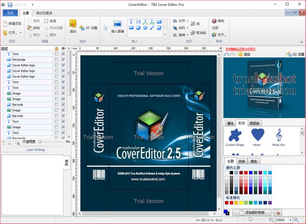 TBS Cover Editor包装盒设计软件是一款非常简单的包装盒设计制作软件,尽管它在设计功能上并不如 Illustrator、CorelDraw 等平面设计软件专业。但是它拥有的 3D 渲染引擎却可以即时生成3D的包装盒效果图,可以为CD、DVD或书籍封面、包装盒设计带来更逼真的3D效果。先进的算法可以生成高清晰的3D图像。可谓所见即所得,利用 TBS Cover Editor 来制作一些书籍、软件盒的演示效果图还是相当方便的。【软件特色】