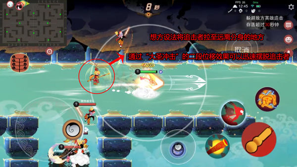 造成这一现象的原因就在于孙悟空的位移技“大圣冲击”的附带效果——分身存在期间,若再次释放将飞回分身所在地。也就是说唯独孙悟空具有二段位移的能力,如果可以利用这一特性,就能与追击者拉开更多距离:当孙悟空在释放第一次“大圣冲击”后会有4秒左右的时间供我们再次释放技能,只要在前3秒利用水法宝的闪烁效果将追击者引至远离分身的地方,最后一秒回到分身所在地并反向移动就能瞬间拉开与追击者的距离,通常来说至少可以争取3秒的安全时间!