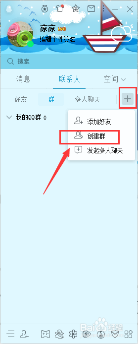 在右侧位置有个大大的 + 符号,点击打开后,里面有添加好友、创建群和发起多人聊天三个选项,点击创建群组。