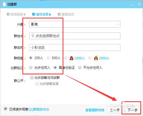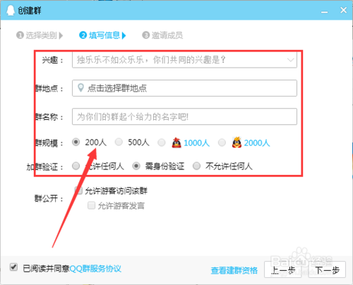 对群组起个名称,输入一个地点,按照要求逐一对应填写,群规模在新建群是只能选择200人的群