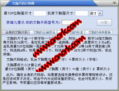奈瑞儿文胸尺码计算器是一个根据女性胸部尺寸来计算合适的文胸尺码的工具。方便各位姐妹在买胸罩前测量自己的胸部大小,买到舒服的文胸才不会让自己的胸部受虐待哟。
