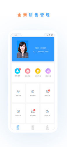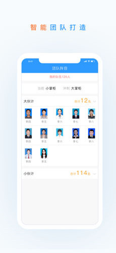 点击团队阵容可以看到目前团队人数与团队构成情况;用户可以随时查看当前存库剩余数据,了解销售情况;