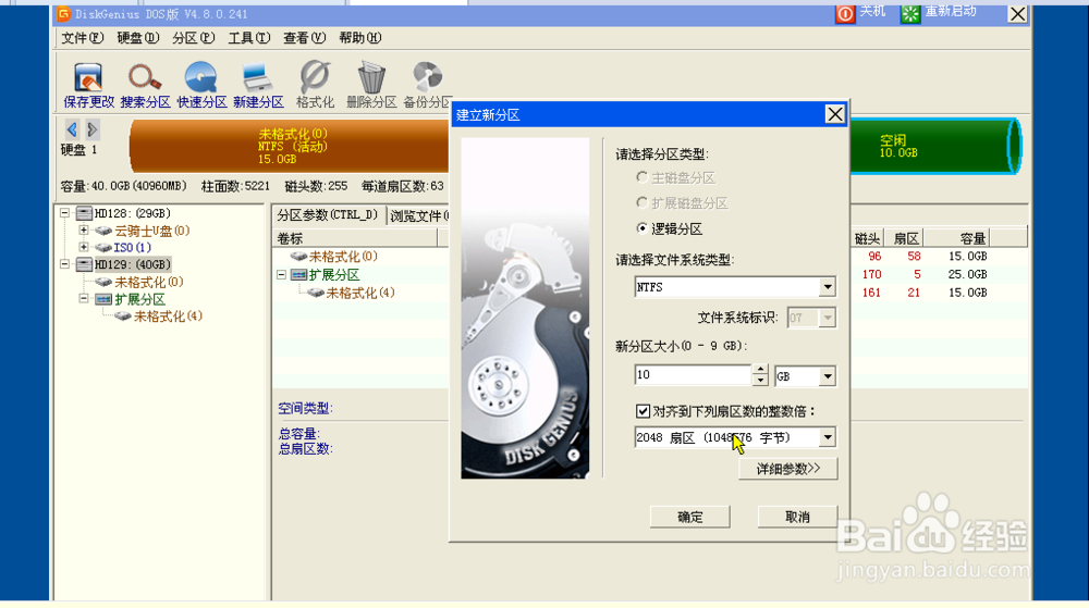 这一步主磁盘分区和扩展磁盘分区都成了灰色了,默认是逻辑分区,在这里我们只要修改将要为扩展分区的第一个盘分配的大小就行。确定。