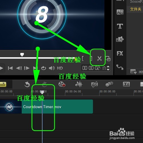 5、如图不想删除则拉动素材序列面板中的时间线并点击剪刀图标即可剪切视频。