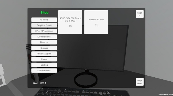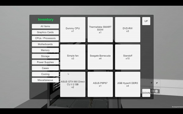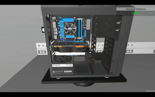 游戏中你身处一个仓库房间,里面堆满了你需要的一切:主板、电源、cpu、显卡....你可以自由支配2000美元的预算来完成一台电脑,不过目前这款游戏还是处于alpha的状态,也不确定是否能推出最终版本,游戏中的硬件很少而且有些价格实在让人想吐槽,虽说问题非常多,甚至连一款游戏都称不上,但是作为一款安装电脑的模拟器,总比自己把电脑拆了然后试着安来得容易。其实现如今的电脑接口比起几年前已经简单了不少,只要记住一些基本的部件的安装位置,走线就是顺着来的事了。