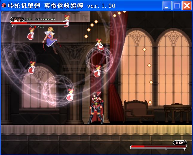 《红魔城传说:绯色的交响曲》是由Frontier Aja进行开发制作的一款以东方系列人物为题材、结合了恶魔城和东方弹幕游戏玩法的二次创作同人动作游戏。游戏类似于恶魔城一样,虽然看起来只有简简单单的两个按键而已,但是玩起来才能够知道其难度。每关的boss都需要玩家慢慢的琢磨打法,需要非常大的耐心才能够顺利过关。本作是《红魔城传说》的第1作,游戏很像恶魔城,是东方Project 的同人游戏作品。为了保持东方系列原汁原味的特色,游戏设计成经典横版卷轴式动作游戏,共有8个关卡。