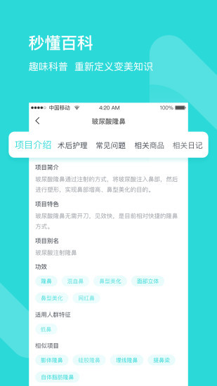 1、日记——记录真实案例:在这里分享您的变美历程2、百科——了解百科涨知识:在这里分享您的变美历程