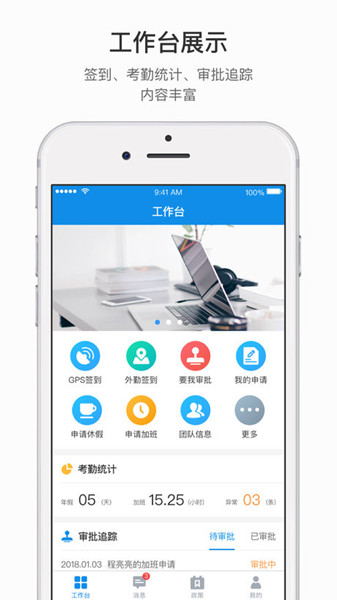-提供请假、申请加班、审批、查看假期等自助功能,满足企业日常申请功能,让HR工作更高效