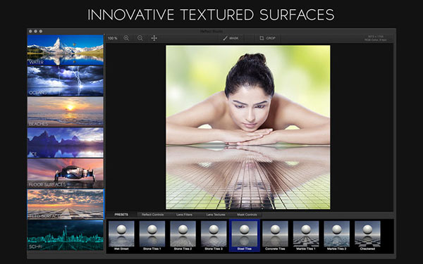 Reflect Studio Mac版是一款Mac OS平台上的图片处理软件,Reflect Studio是一款倒影编辑器,不仅能模拟水波纹,还能模拟光滑地面、镜面的倒影,一下子就从普通照片升级成精致的作品了。普通的照片微调一下光线,再做出像是在水波纹里的倒影,一下子就从普通照片升级成精致的作品了。之前曾介绍过几款在手机上这样编辑图片的软件,但如果需要细扣细节,做出更为精致的效果,在 Mac 上操作会好得多哟!小编给大家推荐的这款软件就Reflect Studio是款不错的倒影编辑器,不仅能模拟水波纹,还能模拟光滑地面、镜面的倒影,获取方法十分简单。