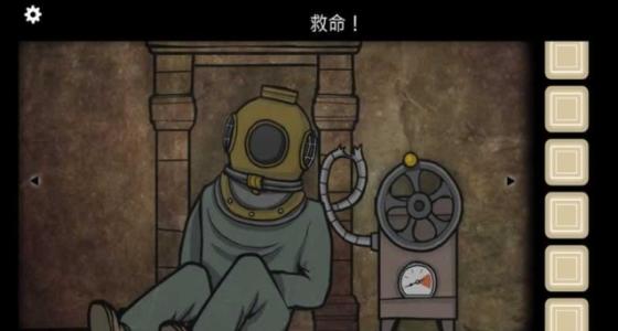 第二幅壁画,侦探乘电梯来到湖底,五个客人的大黑在阻拦他,穿着潜水服的猫头鹰先生帮助他进入了一个小屋。