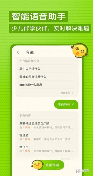 * 语音助手:将汉语和英语的查词翻译需求融入智能语音交互,用语音问答式的学习模式,符合少儿和家长伴学的场景需求,有道少儿词典app提供智能对话服务,寓教于乐。