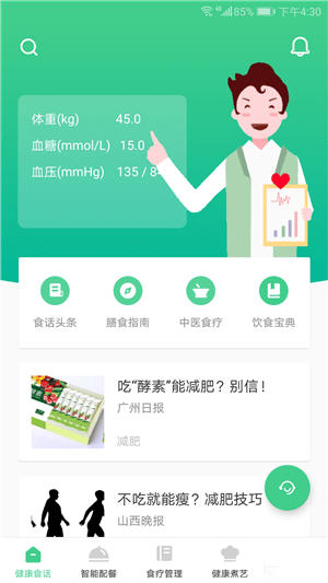 食疗管理,制定你的专属目标管理计划,满足减肥、母婴、慢性病等特殊人群饮食需求。展示你引以为傲的厨艺,同时有更多营养师以及其他大咖教你怎么做健康美食,与志同道合的人一起分享健康美食生活。
