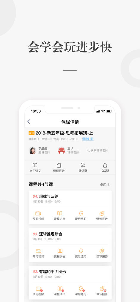 直播授课:面对面互动授课,随时随地在线学辅导答疑:拍题上传,辅导老师在线答疑、订正习题
