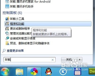 2、进入程序和功能还可以在开始菜单的搜索框输入“卸载”,即可找到程序和功能窗口