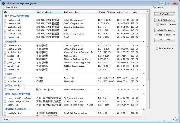 DriverStore Explorer开启后,会扫描DriverStore目录下的文件,然后把驱动通通整理出来。在DriverStore Explorer界面中,可以看到各种驱动的不同版本,这些驱动对应的硬件、开发商、版本号、日期以及体积大小等信息,都会罗列出来。可以看到,的确有很多老驱动占用了硬盘空间!