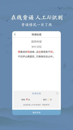 在线背诵,在线朗读,在线听古诗,用家乡话读、陪着孩子读、学古人吟诗、配乐朗诵 … 人工智能AI识别,衍心古诗词大全app让古诗词学习也充满趣味,让检查作业不在难,让寒假变得更轻松,让孩子学习古诗词更效率。