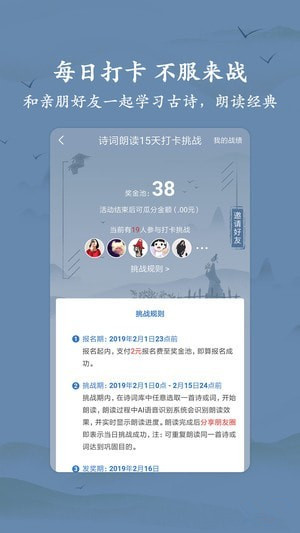 5、新春到,福利到,和亲朋好友每天参与诗词打卡,一起温习经典,传承传统。