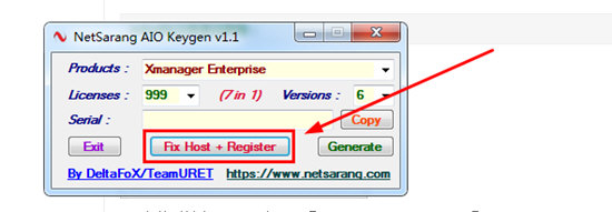 3、成功安装后,先不要运行软件,打开xshell6注册机“netsarang_aio_7in1_keygen_v1.1_dfox_uret.exe”点击“Fix Host + Register”即可成功激活;