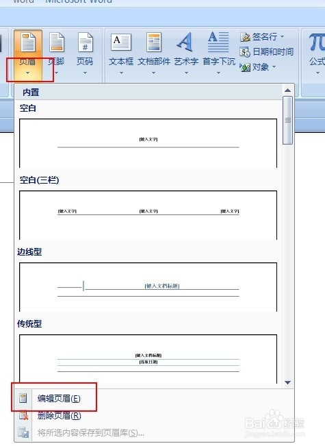4、最后点击页眉小三角,选择编辑,目的就是让其保持编辑状态
