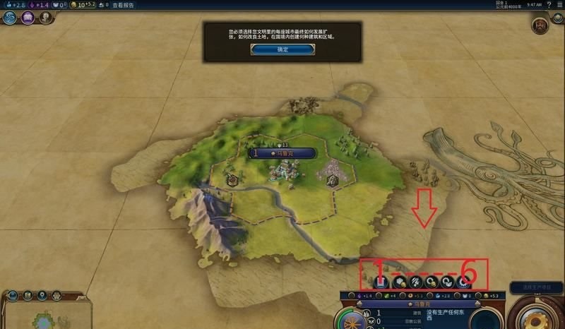 你有一座城市了,我们来看如何运作,箭头所示的城市功能键,从1到6编号: