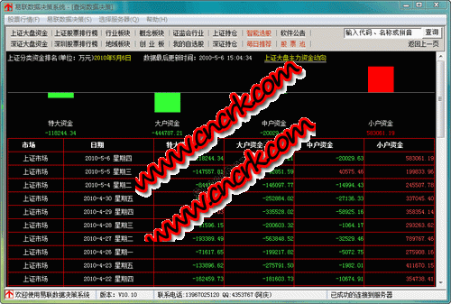 易联数据决策系统主要是查看分类四项资金流向 ,分别是:超大户资金、大户资金、中户资金、小户资金流向。可以查看沪深证股票散户持仓、中户持仓、大户持仓、超大户持仓和主力持仓数据。