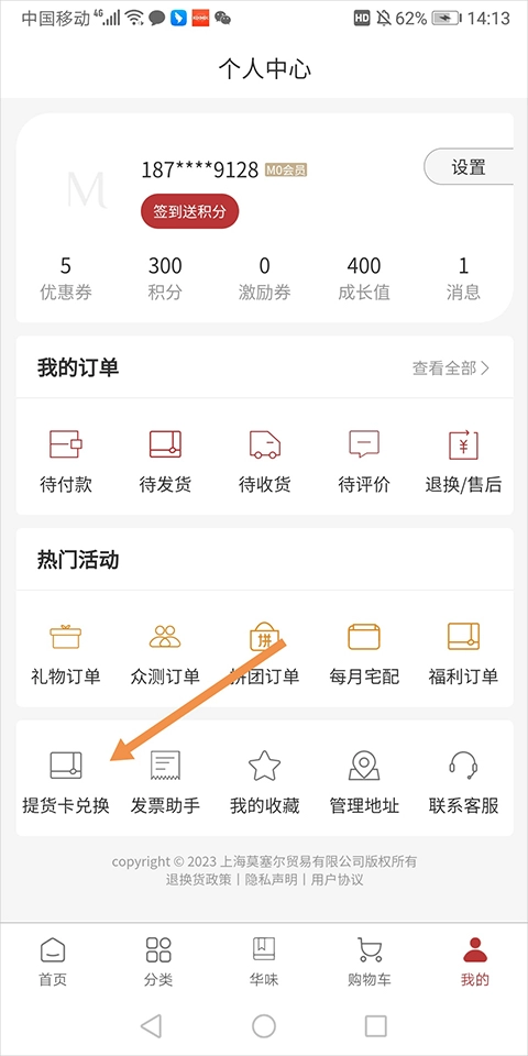 1. 打开莫塞尔商城并完成登录,进入【我的】页面,随后点击【提货卡兑换】。