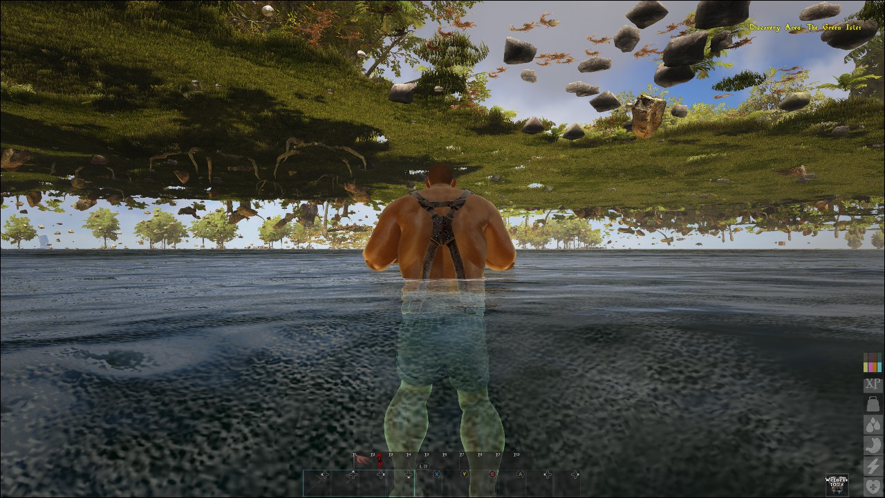 前期喝水的方式主要有两种,一是找到内陆的淡水湖泊,进入水中就会自动补充。另外制作好的革制水壶也能拿到湖里进行储水。