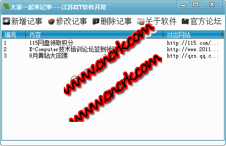 大家一起来记事 V1.0 绿色免费版 大家一起来记事:此软件为江苏eit----大家一起来系列第二套软件,此软件为方便qq发烧友的每日活动礼包领取,各大网站的签到活动,游戏礼包类的网站形式每日访问领取积分礼品的功能,又可以进行日常的生活的记事之用,双击项目便可以打开对应的网站,右击可以查看内容和标记完成项目!