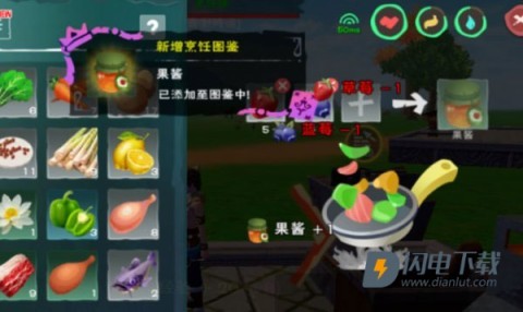 6、这样,果酱就制作完成啦,其能使食物属性增加20,相比单独食用草莓或蓝莓,属性加成高了许多。在研究菜谱之后,还可运用“快速烹饪”功能来批量制作果酱。